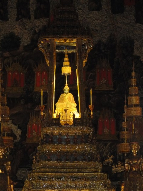 Following the destruction of the great 14th century Thai capital of Ayutthaya in 1782 at the hands of the Burmese, the founder of the Chakri dynasty, Rama I, moved the capital 40 miles south and established Bangkok. King Rama I literally had the course of the Chao Phraya River altered along with the construction of numerous canals to surround the new capital with a watery moat. That same year, he began the construction of the half square mile Grand Palace complex on the river’s bank. At the center of the complex is Wat Phra Kaeo, the Temple of the Emerald Buddha (actually solid jade and robed in rich garments that change with the seasons. The Emerald Buddha itself was a prize of war from present day Laos centuries ago.)