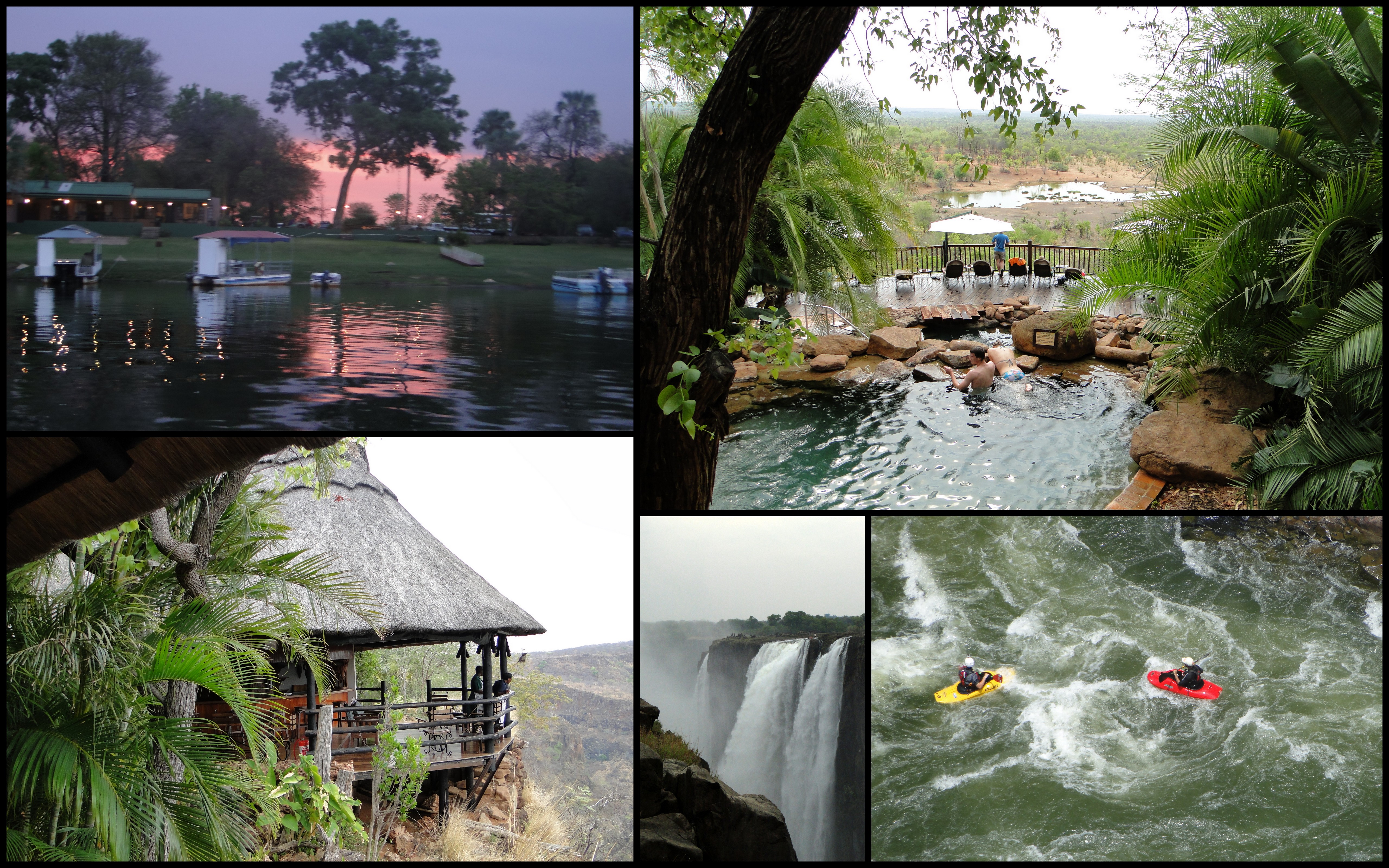 20111031-181928 Tuesday, 20 March 2012 5120 × 3200 Zimbabwe’s Inns and Lodges in the National Parks (clockwise) sunset on Zambizi River, at Victoria Safari Lodge, rafting on the Zambizi, Victoria Falls, Gorges Lodge
