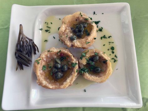 - To serve, remove from the broth and arrange on plates. Drizzle with olive oil, capers and parsley.
