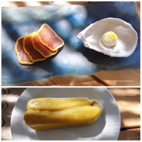 The botargo has a lightly chewy texture due to the process; yet its unique flavor is intense. Although like wine, flavors can very depending on the life-style and age of the cephalus, I detected hints of mango and sea urchin tongue. Allow the botargo to linger in your mouth to maximize the subtly sweet umami experience.