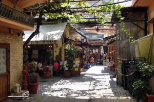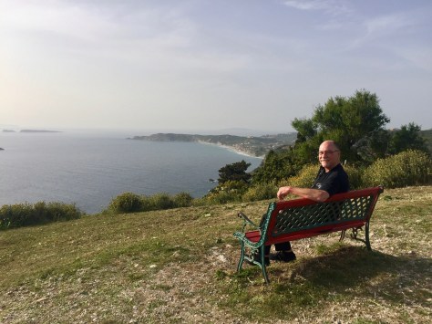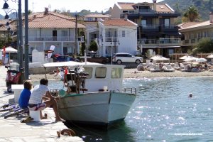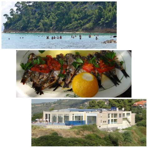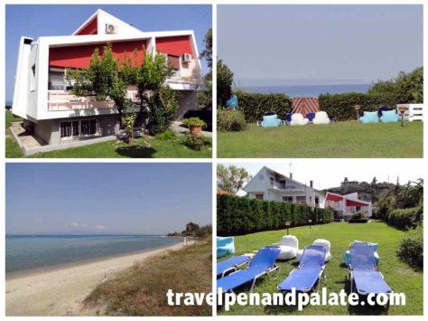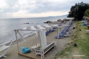 The compact beach and tree shaded grass lawn provides comfortable lounge chairs with service from the Aelia bar and restaurant and protected swimming in the clear Aegean.