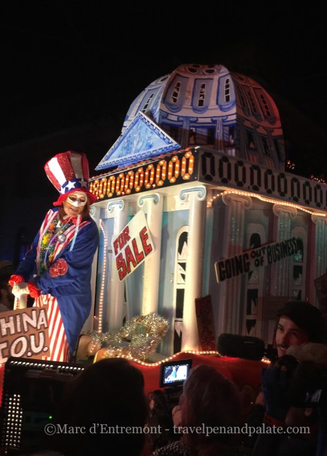 The opening parade January 31 for the 2015 New Orleans Mardi Gras season by the Krewe du Vieux maintained the traditional small scale donkey or man-power drawn floats but was LARGER THAN LIFE in political satire mixed with “adult themes.”