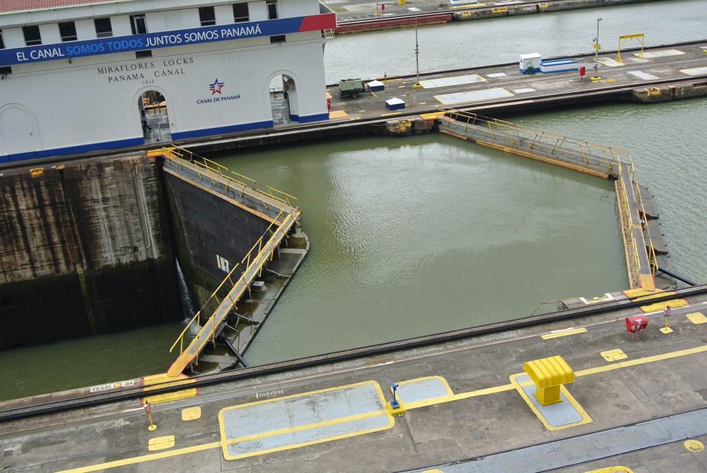 The only opportunity close to Panama City to view any of the operation of the canal is at the Miraflores Locks at the canal’s Pacific entrance. Miraflores is one of the three locks and the name of the small lake that separates these locks from the Pedro Miguel Locks upstream. In the Miraflores locks vessels are lifted 54 feet in two stages allowing them to transit between the oceans.