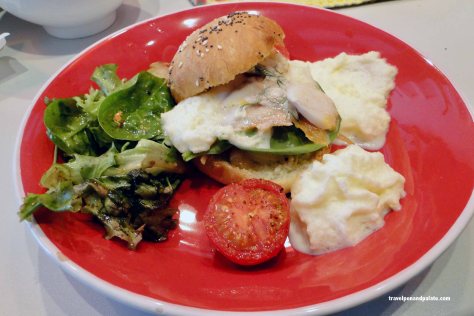 Brunch at Marathia in general follows hotel patterns in so far as a buffet includes a variety of their cheeses, marinated fish, local sausages, yogurt, fruits and savory dishes. What from a distance could be mistaken for pastry layered with cream topped with strawberries was a baked savory pastry layered with cheese, herbs and topped with cherry tomatoes.