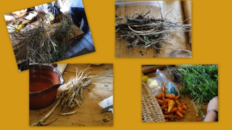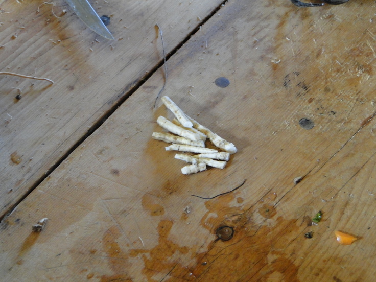 Carrots are carrots and even in this very late October day, they were still fresh in the garden. Scorzonera though is something else and you’ll not find it in any market. You have to grow it yourself. Known in England as Viper grass, its root is the only edible part, but it’s a very thin root. After scraping the skin off, what you have are very thin pieces of a root vegetable which was fried or steamed and frequently cream and butter were added. Its flavor is akin to a mild carrot. In the 19th century it fell out of the general cooking repertoire and was replaced by parsnips. Since the amount was so small we simply added them to the carrots and simmerd both over the fire for about one hour.