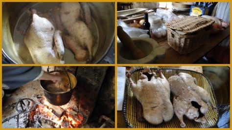 To translate: for 8 servings – 2 to 3 whole ducks covered with water or chicken stock. Add 5 to 6 chopped anchovy filets, peel of one lemon, 12 – 15 whole pepper corns, and one large onion chopped, 1 t. ground mace, and 1-1/2 cups red wine. Simmer until ducks register 165 degrees with a meat thermometer. Remove the ducks from the stock and keep warm. Strain the stock. Skim as much fat as possible. (If you prepare in advance, refrigerate both the ducks and the stock overnight. All the duck fat will solidify on the top and you can simply remove it.) Return to the fire, or stove, and add 1 to 2 cups of bread crumbs and ¼ pound of butter. Simmer until thickened.
