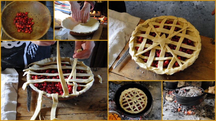 If baking on an open fire, place the pie pan into a cast iron Dutch oven and cover with the lid. Place on the coals of the fire, or better, on a cast iron trivet above the fire, and cover the top of the lid with coals. Rotate the Dutch oven after 20 minutes. Check the pie after 40 minutes by removing the coals from the top of the lid and checking to see the color of the crust.