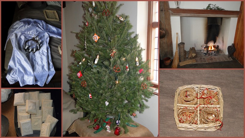 Swedish settlement in the Delaware Valley preceded William Penn, and they remained an important part of the colony. They brought over their pre-Christmas festival of St. Lucia (above left) its saffron bun (Lussekatter) and simple woven decorations (lower right). Although there is no evidence that the Christmas tree was used by Germans in the colonial period, they did decorate with boughs of greens, made pretzels (praying hands – see center picture) and a number of cookies that have become American traditions – Lebkuchen, Pfeffernusse, Anisplatzchen.