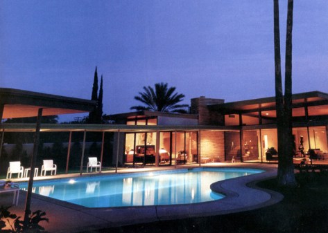 European born, Bauhaus educated refugee and architect Richard Neutra‘s Kaufmann Desert House, 1947, set the tone with a dramatic yet natural glass, rock and steel residence overlooking Palm Springs. With the sandy rock the same color as the surroundings it seems the house has grown from the hillside. This was not the first time Edgar Kaufmann, Pittsburg department store tycoon, had championed modernism. A decade earlier he had commissioned Frank Lloyd Wright to build Fallingwaters in southwestern Pennsylvania – considered the greatest mid-century home in America.