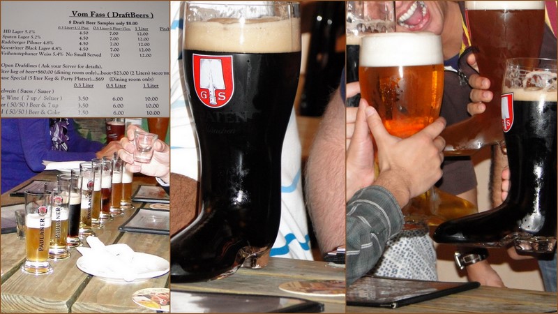 (Bottom left): beer flights w/schnapps, (center & right): "boots" of beer at Lederhosen
