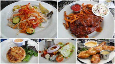Gem and Keystone Brewpub: (clockwise) Limestone Springs Trout with Asian sauted vegetables, cold smoked Baby Back Ribs, Soft Pretzels with Cheddar Ale Dip, Lettuce Wedge salad with Calkins Creamery Blue Cheese, Jumbo Lump Crabcakes
