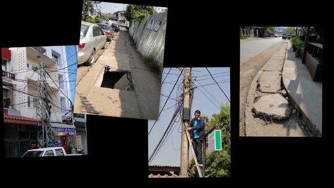 As flexible as Buddhism is, modern Thai’s have few issues with Starbucks, cell phones or even fat expats, but the shorts for sale in the upper right picture are strictly for foreign women (unless you want to be a Thai woman with a tarnished reputation) and no Thai guy would go shirtless unless at the beach – which is no where close to Chaing Mai. That said, Chiang Mai is not an attractive city. Many of its old teakwood structures are found scrunched tightly among mold stained concrete buildings of more recent vintage. Like most Southeast Asian cities, sidewalks crumble under persistent floods of the Ping River during rainy season, their primary use as motor bike parking lots and spontaneous “stores” for sellers of everything from sunglasses to spicy hot chicken feet.