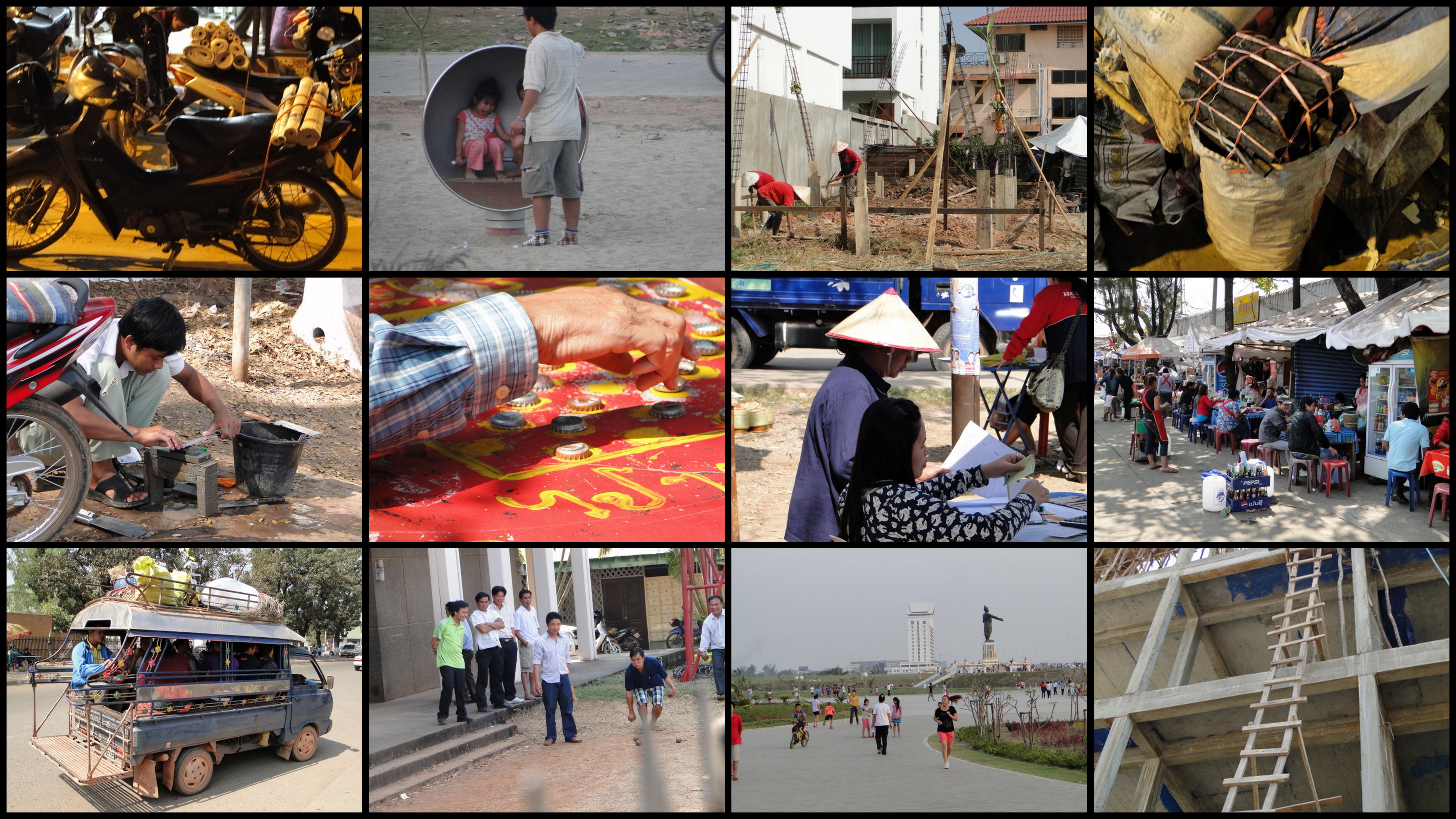 everyday life: fresh charcoal, knife sharpeners, bottle cap checkers, tuk-tuk cab, bocci ball and bamboo construction ladders