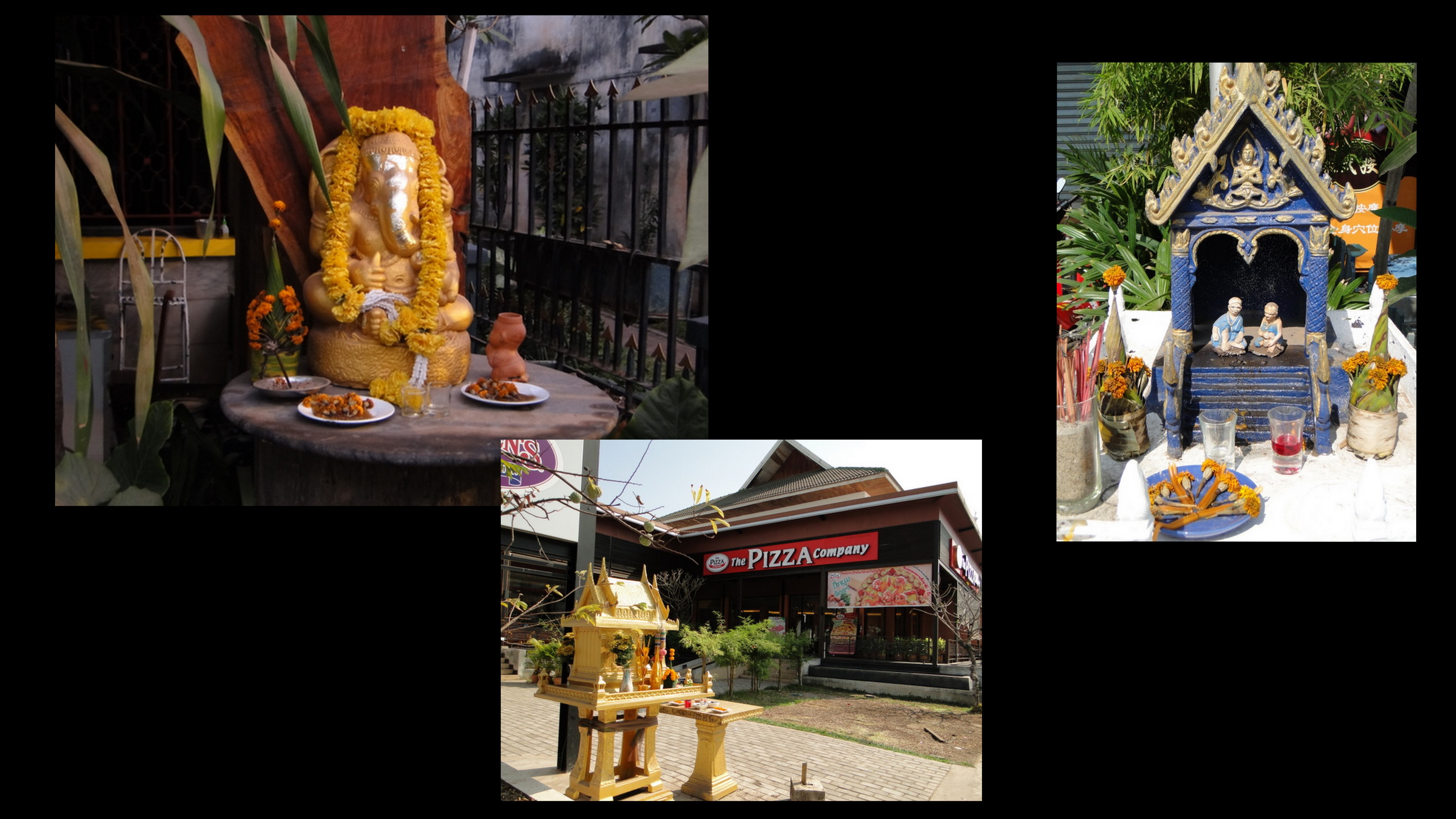 infrastrusture? Repair?a few of the many Spirit Houses in front of shops, homes and a pizza restaurant