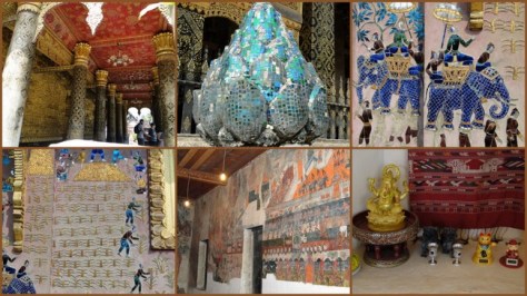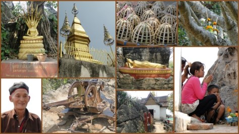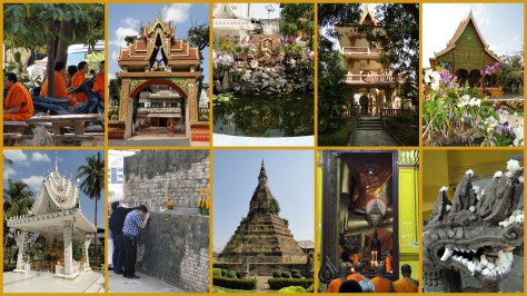 a small sample of Buddhist Wats in Vientaine (bottom center) prayer at That Dam - the revered centuries old Black Stupa - (bottom right) sticky rice offering on a protective naga (snake)