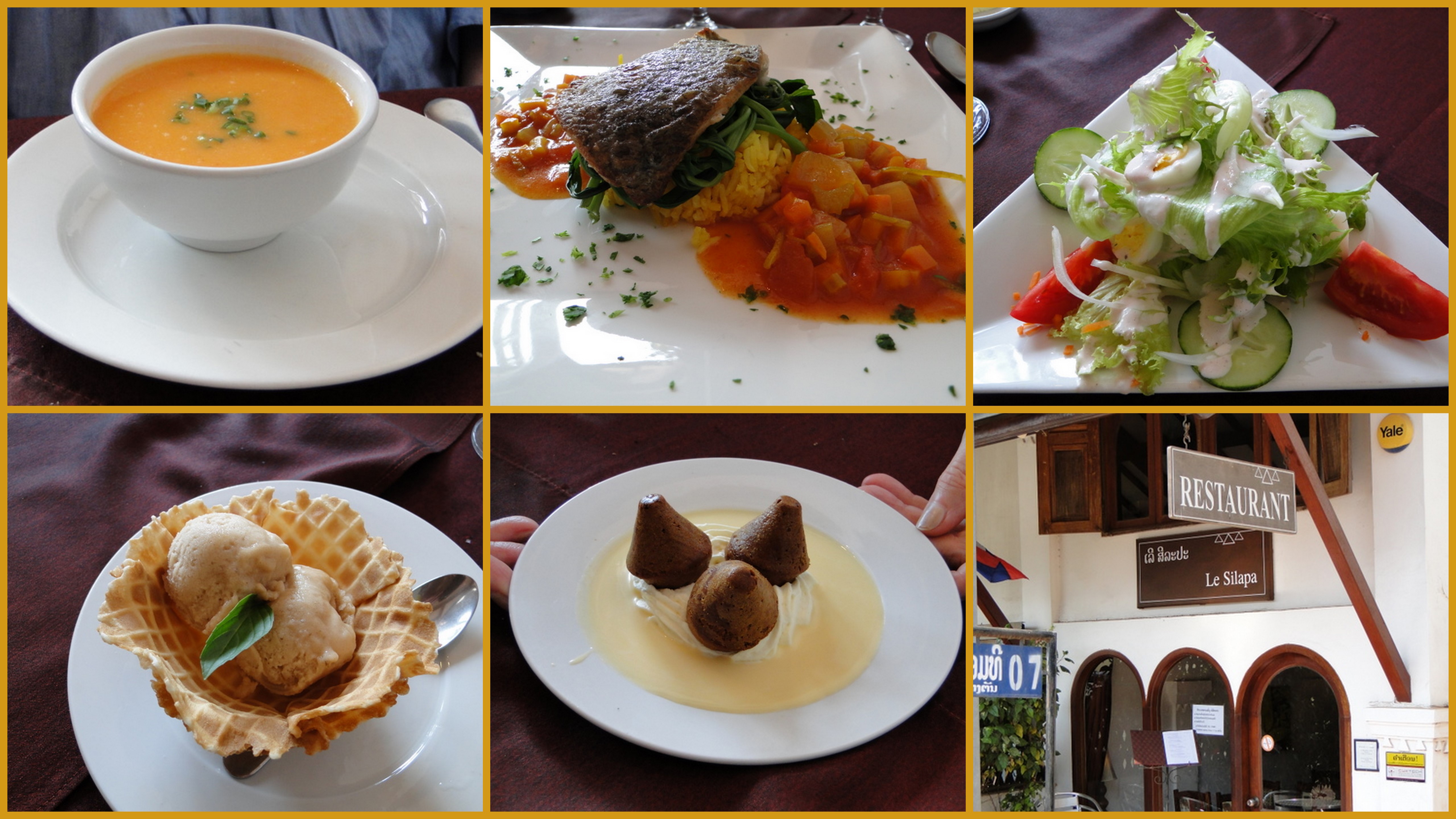 La Silapa: Cream of Pumpkin Soup, White fish with Laos vegetables, salad with a lime dressing, tamerind sorbet, ginger cakes in creme anglaise