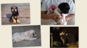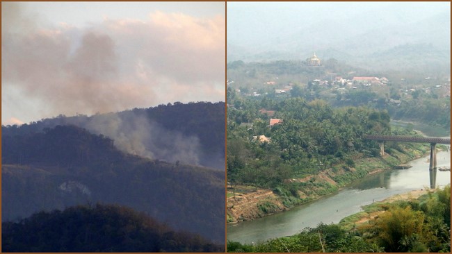 Temple details (note Miss Kitty in bottom right picture)view from Mt. Phousi: fires to clean/clear forest combines with humidity