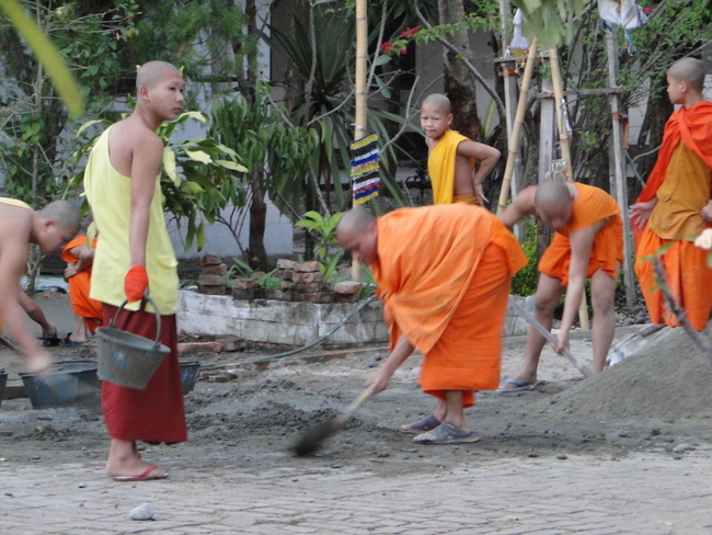 Luang Prabang: people at worknovitiates at work on temple grounds