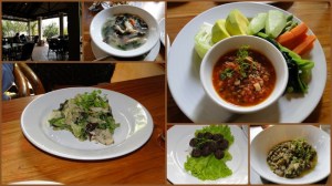 Bopha: (top from left) baked fish, green papaya and chicken salad (bottom from left) steamed rice and grilled pork with crispy noodles