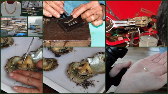 (left) $US1,000 gold cultured pearl necklace, village oyster baskets and farming docks, seed pearls, inserting seed pearl, (bottom) extracting pearl
