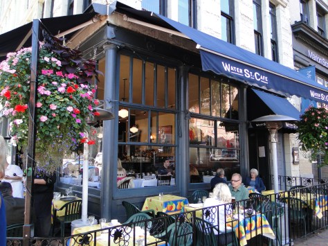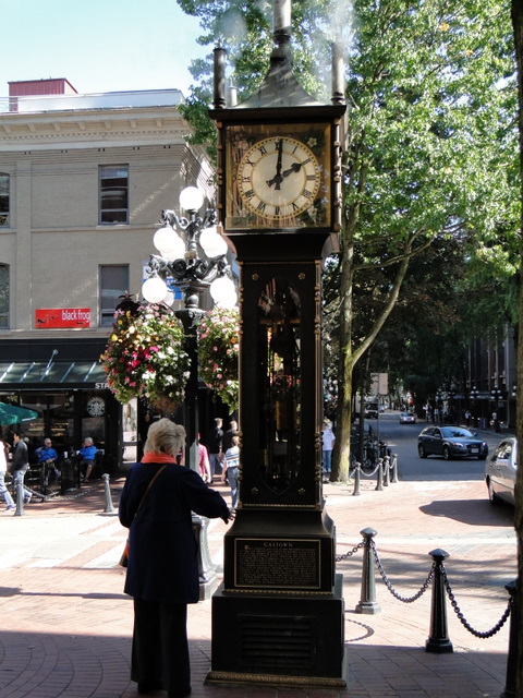 Aqua Riva, 200 Granville Street, is a sleek, ultra-modern, glass sheathed space with spectacular views of Vancouver harbor from all tables. Recommended by friends who had dined there a few weeks before, it was an excellent choice for a first-class lunch. The same friends had told us we must have Heidi as our server, and without remembering in advance, sure enough, we were seated at a table served by Heidi – she’s waving to our friends in the collage (and was a friendly, trained, well informed professional). Aqua Riva specializes in wood grilled meats and fish. As you enter the restaurant, the grilling area is open and blazing with the aroma of good food. Wild Salmon – in every form imaginable – is available at every good restaurant along the north Pacific coast and we had had our full after nearly two weeks of travel. My wife had Cream of Sweet Potato Soup and Curry Roasted Lamb Sirloin Wrap and I had a daily special, Grilled New Zealand Lamb topping a square of fried couscous and crisp steamed vegetables on a demi-glace green peppercorn sauce. All was flavorful and well-seasoned, although I had asked for my lamb to be medium rare and it came well done – minor fault. Lunch with wine and tip was $100 for two. I would highly recommend Aqua Riva based on the ambiance, service, food and view – a couple would spend much more at lesser venues, but you will spend more for dinner.
